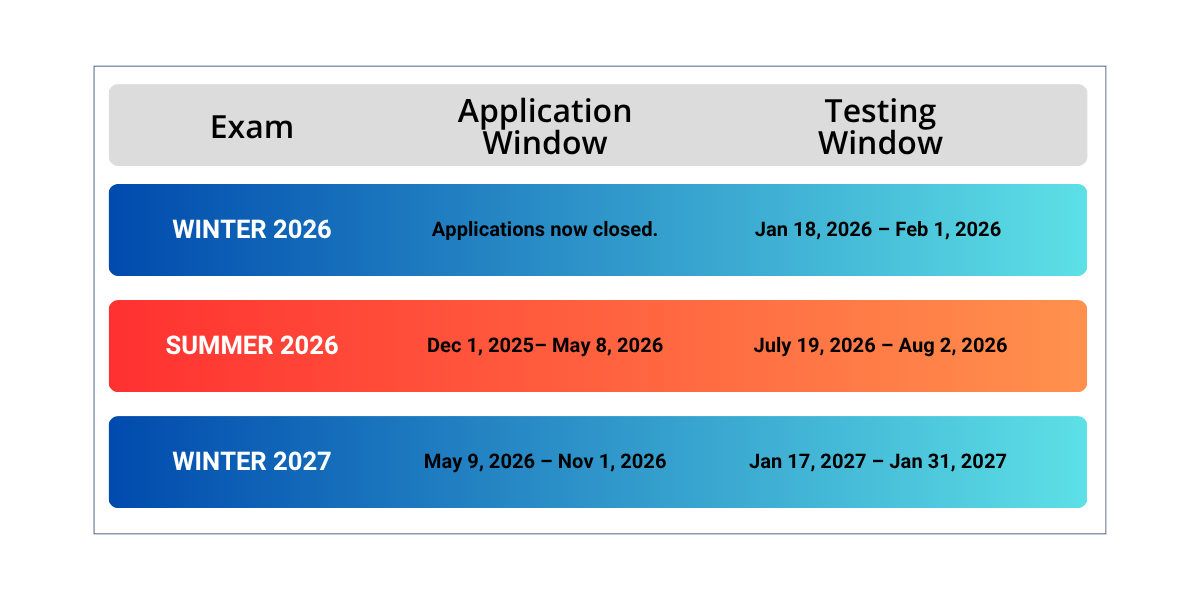 | Summer 2026 Exam Reapplication - Retake for Prior Applicants - coming soon! | For prior applicants who did not attain a passing exam score and are eligible to reapply during their established eligibility period. | $395 |